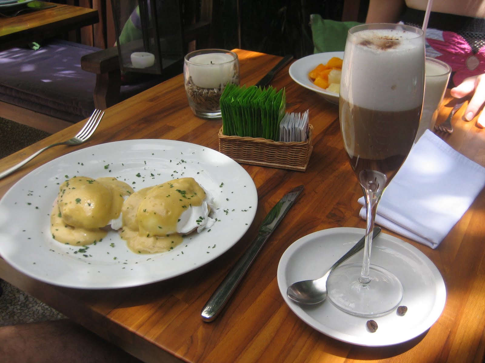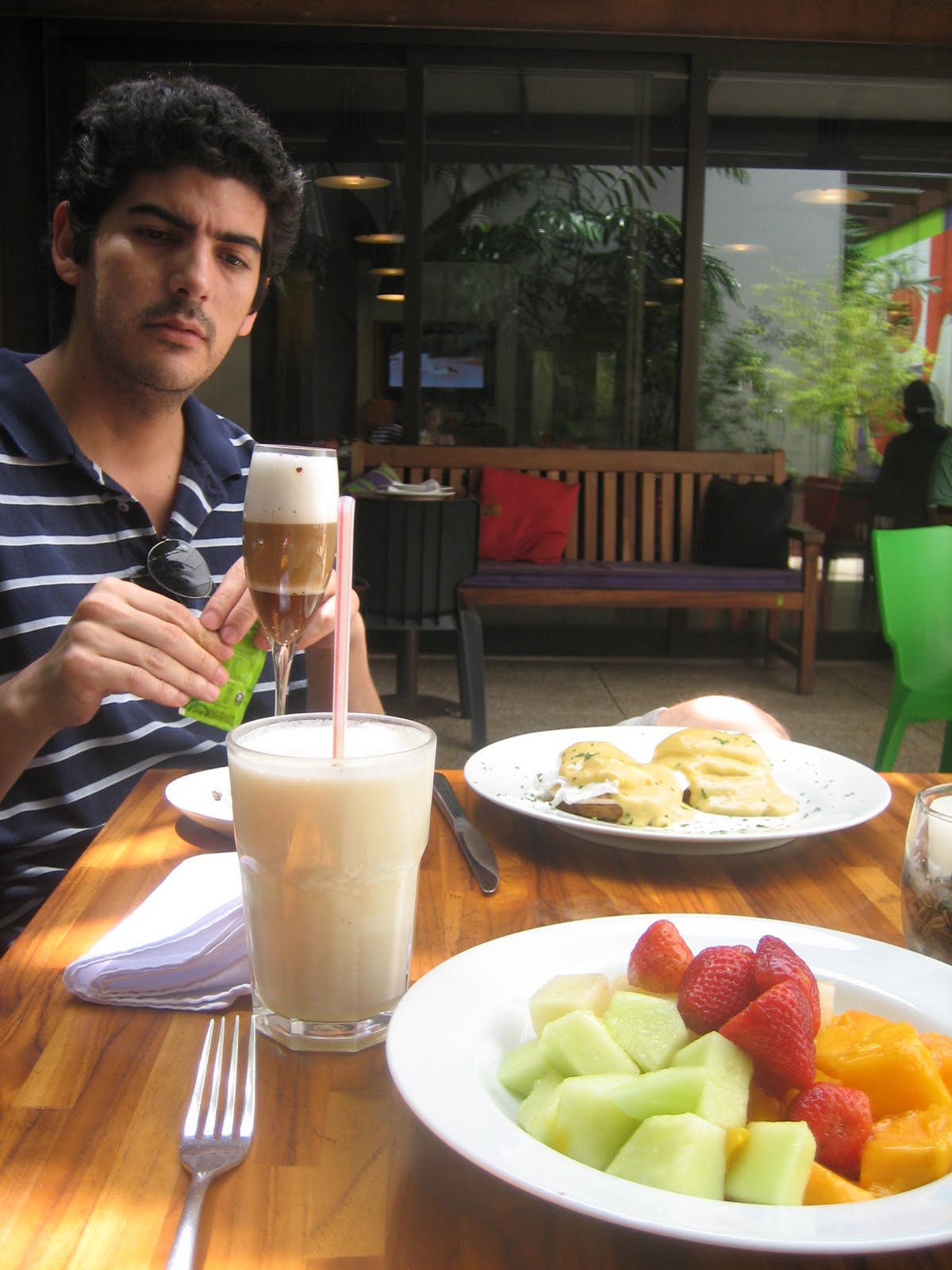 Eggs benedict, fruit plate, smoothie with pineapple strawberry and ginger, and a café mocha – great way to start the day in a bright shiny happy restaurant. I’d kill for a place like this in Buenos Aires.