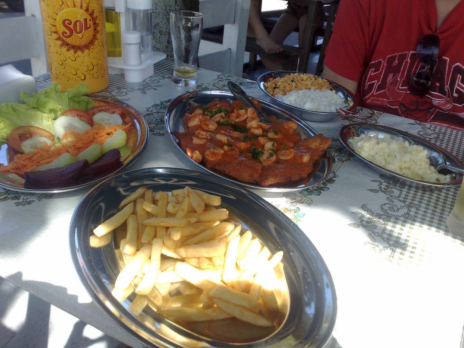First night in the south of Brazil, Armaçao beach in Florianopolis – still didn’t learn about the massive portion sizes. There was one place open in this small, deserted beach town. The menu had 3 sizes – full portions, 1/2 and 1/4 portions. Just wanted a little snack so the 1/4 portion size seemed to be the best option – again, a ridiculous amount of fresh from the ocean shrimp (fried), salad with lettuce, carrots, beats, and cucumber, 2 types of rice, potato salad and french fries.