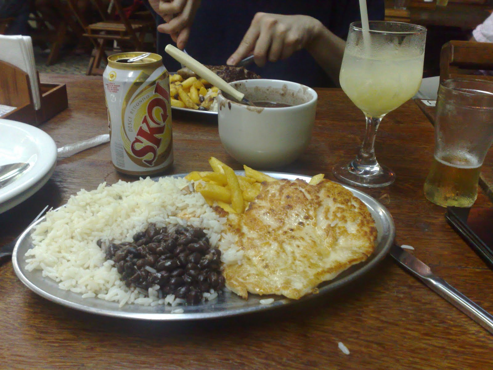 Welcome to BRASSSILLLL: first night in Rio and had to order something stupid, simple and cheap — grilled chicken or steak, with beans rice, fries, spice, Skol, caipi and a can of Guaraná. OIIIII BRAZIL!