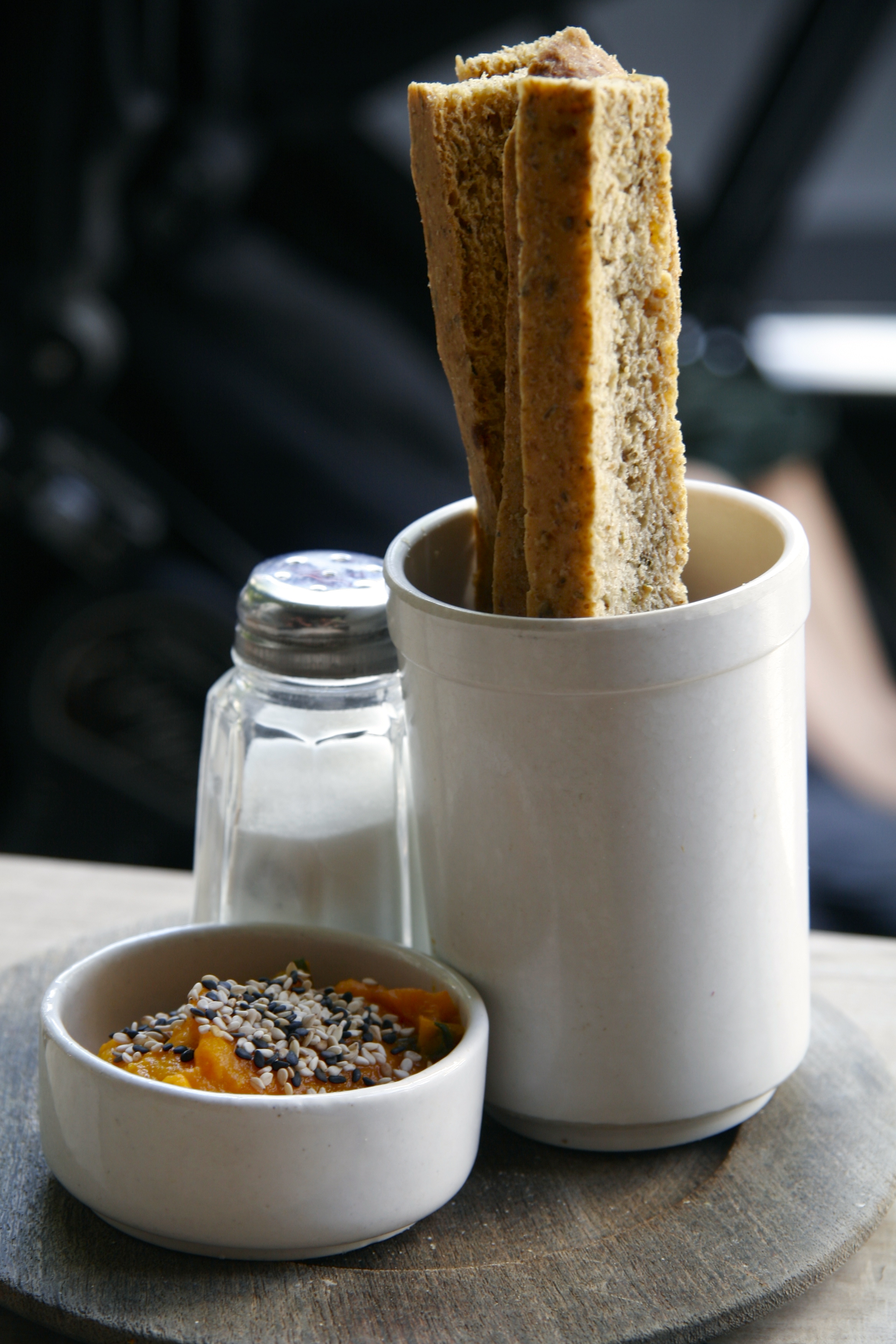 With every meal, they first bring out some grisines, a bread stick like treat with a side dip — like carrot and sesame.