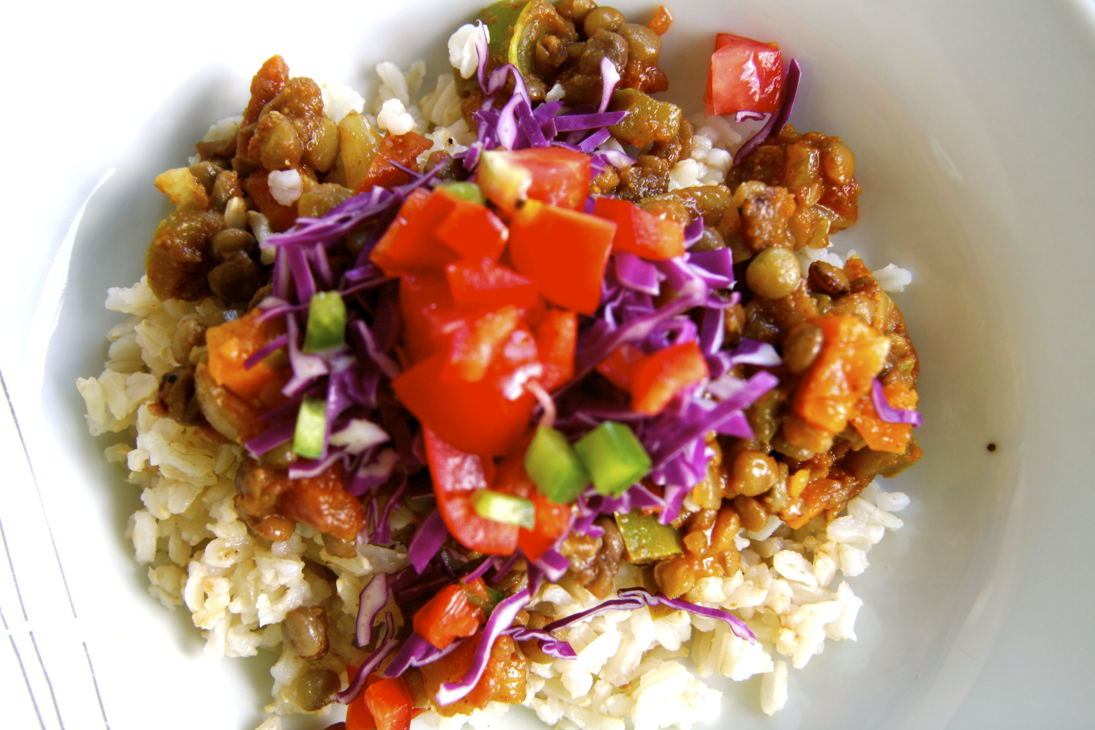 On a health kick, this has been my go-to dinner when I don’t know what else to cook: brown rice, lentils with tomatoes and a shitload of spicy Indian spices, topped with shredded cabbage, tomato, green pepper dice in a mint-cucumber yogurt dressing.