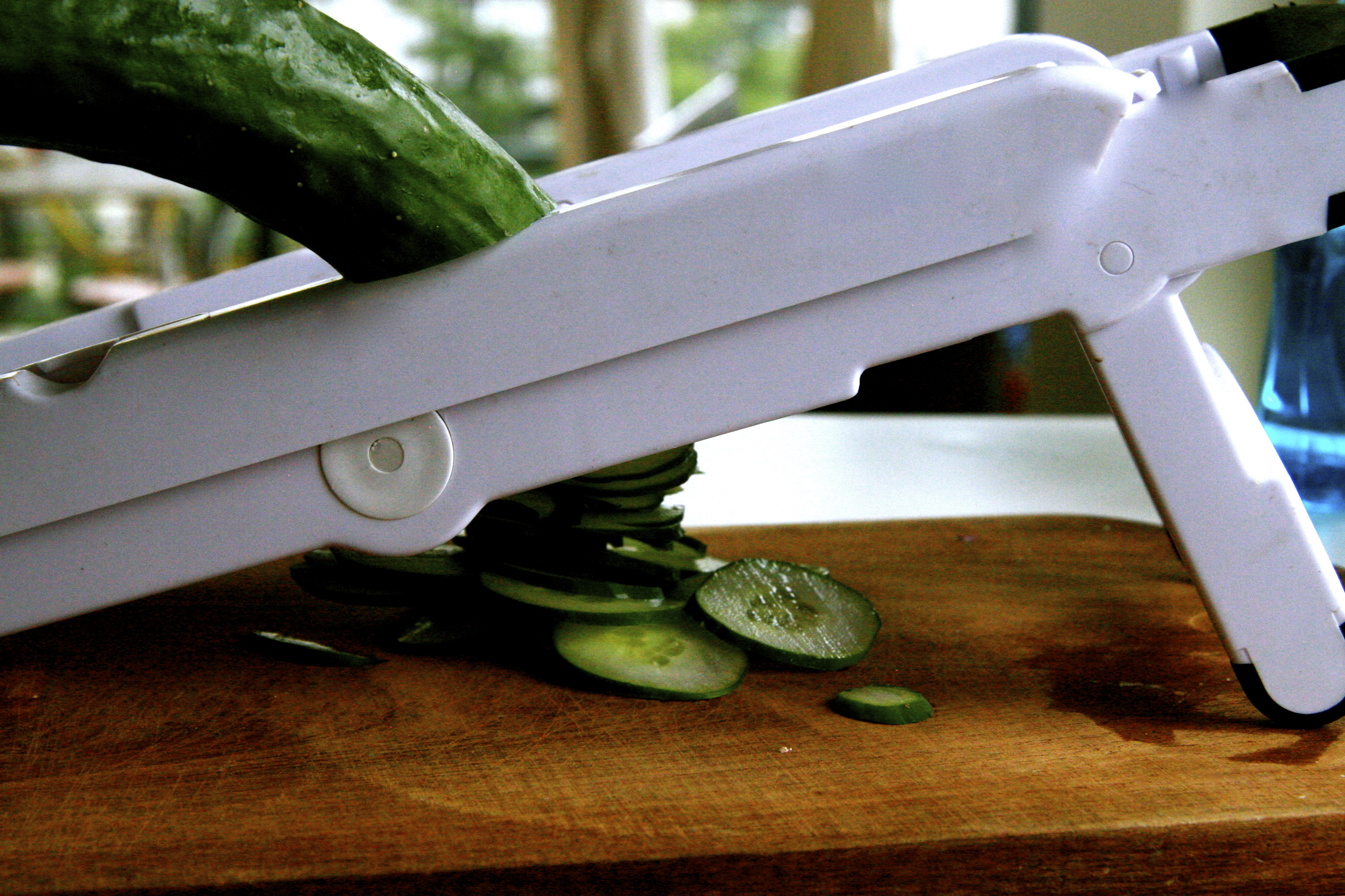 Meanwhile, use a mandoline and slice those cukes up thin, next time I’ll use a crinkle blade to make them extra fancy.